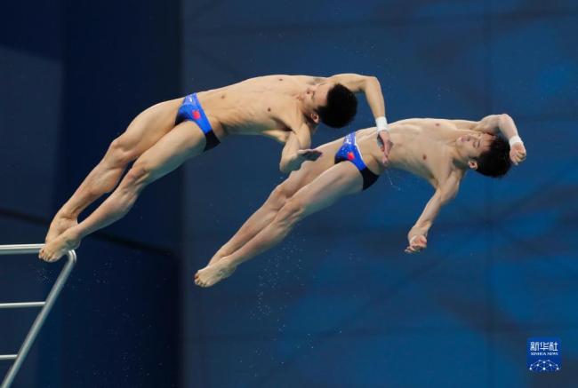 6月28日,练俊杰(右)/杨昊在比赛中。 新华社布达佩斯6月28日电(记者刘旸、陈浩)在2022布达佩斯游泳世锦赛28日举行的男子双人10米跳台决赛中,中国组合练俊杰/杨昊以467.79分夺冠。这是中国跳水队在本届世锦赛上夺得的第四枚金牌。