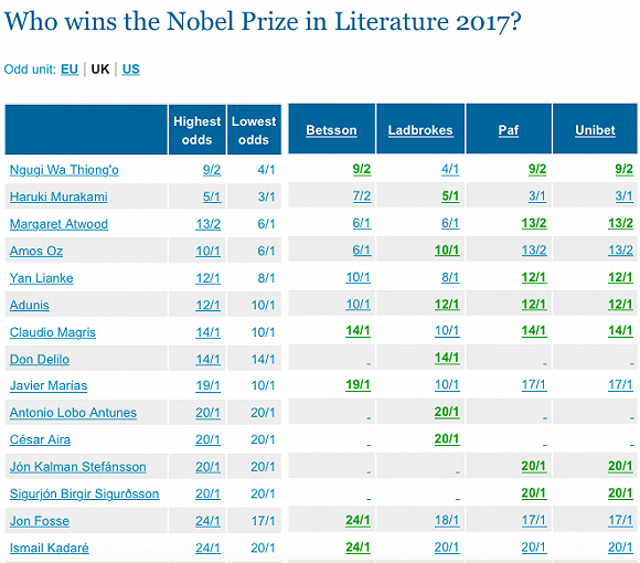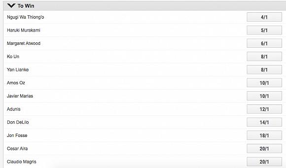 今日北京时间晚7时(瑞典当地时间下午1时),诺贝尔文学奖即将揭晓。由于文学奖不像物理学奖、化学奖那样具有明确的评判标准,加之瑞典学院设立了“提名保密50年”规则(不准外泄提名人的姓名及资料),因此,文学奖是每年悬念最大、预测最难的奖项,人们往往只能借助博彩业一窥热门人选。 英国立博(Ladbrokes)公司曾因押中莫言获奖名扬天下。截至今日零时,2017年诺贝尔文学奖立博赔率榜上的前三位作家分别是:肯尼亚作家恩古吉·瓦·提安哥、日本作家村上春树、加拿大作家玛格丽特·阿特伍德。跟过去几年一样,以色列作家阿摩司·奥兹和叙利亚作家阿多尼斯的排名也相当靠前。 ![]() 玛格丽特·阿特伍德在国内声誉甚高,早在加拿大女作家爱丽丝·门罗捧得诺贝尔文学奖之前,加拿大国内评论界曾几乎一致认为,国内具备实力拿下诺贝尔文学奖的作家首推阿特伍德。不过,加拿大文学研究者北京大学副教授丁林棚曾表示,“门罗获奖,接下来阿特伍德基本没什么希望再得了。”阿摩司·奥兹是最具国际影响力的希伯来语作家,也被称为当今以色列文坛最杰出的作家,其作品被翻译成30多种文字,屡获殊荣,也几乎年年是诺奖热门。曾有报道称,奥兹善于处理纠结复杂的宗教、文化、族群和历史冲突题材,政治相当正确,但2006年土耳其作家奥尔罕·帕慕克的获奖,让奥兹获奖的可能性拖后了很多年。阿拉伯诗人阿多尼斯是近年来诺贝尔文学奖的热门人选,他从2005年起进入赔率榜,2011年曾位居榜单首位。 以博彩方式猜测诺奖得主看起来并不专业,却极具参考价值。《纽约客》杂志曾经刊发专文介绍“诺贝尔奖竞猜史”,文中提到了一位诺奖赔率编制人员的工作,他业余写点儿诗,依靠接触文学圈、逛文学论坛、刷作家的社交网站来编写获奖赔率表。在赔率表建立起来以后,再根据买家的下注情况对赔率进行调整:在某个作家身上下注的人越多,这个作家的赔率就会被调整得越低。 肯尼亚作家恩古吉·瓦·提安哥成最大热门2016年的诺贝尔文学奖剑走偏锋,颁发给了音乐人鲍勃·迪伦,引发诸多争议,迪伦本人得奖之后的一系列表态和动作也始终吸引着媒体的目光。2015年的诺奖则授予了白俄罗斯作家、记者斯维特兰娜·阿列克谢耶维奇,因她非虚构写作类型与诺奖历来风格不符,也引起过一些争议。《瑞典日报》文学评论人波林格(Clemens Poellinger)认为,今年文学奖应该会颁发给一个比较“安全”的作家。肯尼亚作家恩古吉·瓦·提安哥不仅位列赔率榜榜首,包括《卫报》在内的诸多媒体也认为他获奖的可能性最大。 ![]() 恩古吉·瓦·提安哥出生于东非肯尼亚卡米里苏一个贫困的农民家庭,这一地区在地理上属于英国殖民统治下的行政区域,被称为“白色高地”。1962年,恩古吉在非洲英语作家研讨会上遇见了非洲作家沃莱·索因卡和钦努阿·阿契贝,这次重要的会面让他决心走上了“终身非洲作家”的道路。在两部重要的后殖民小说《大河两岸》和《一粒麦种》出版后,他改掉了自己带有殖民象征的名字詹姆斯·恩古吉,恢复使用了他基库裕族的本族姓名。1977年,他因抗议当局对英语的强制性教育而被政府逮捕,拘禁超过一年。获释后与家人过着流亡生活,直到肯尼亚独裁者阿拉普·莫伊下台,恩古吉才最终得以安全回国。由于政治和健康等一系列原因,恩古吉近十几年来旅居美国,在高校教授比较文学。 非洲文学研究者蔡临祥曾将恩古吉成名作三部曲中的《孩子,你别哭》和《大河两岸》译成中文,他介绍说:在肯尼亚独立以前,在白人殖民统治之下,劳苦大众过着被压迫被剥削的生活,而恩古吉的作品犹如战斗的号角,唤起民众,号召他们站起来,团结一致,为祖国的独立和自由而斗争。在非洲各国独立以后,恩古吉又用犀利的笔锋和生动的语言褒贬时弊,无情揭露了各国的黑暗现象,诸如贫富差距、新旧文化矛盾冲突、官场腐败、以权谋私等等。 ![]() 从诺奖的历史来看,上一位得奖的黑人作家还是美国作家托尼·莫里森(1993年),黑人作家与诺奖已暌违24年之久。从地域上看,从2006年至今,诺奖获得者中欧洲作家最多(6位),亚洲和北美洲各2位,南美洲1位,因此今年非洲作家获奖概率被大大提高。 阎连科跻身赔率榜单前五村上春树常年陪跑诺奖,如今已经成为了文学界的一个老梗,今年是他第九次高居赔率榜前列(第二位)。日本文艺评论家高桥敏夫去年曾表态说,村上春树的作品是美国式的文学,而诺贝尔文学奖是一个“以欧洲为中心的奖项”,“在欧洲人看来,美式作品缺乏传统与知性美。而作为日本人,村上春树的作品也没有日本独有的特点。可以说,他处于一个非常尴尬的境地。” 除了村上,今年立博赔率榜上的亚洲作家还有中国作家阎连科和韩国诗人高银,二人并列第四位。阎连科从2015年起进入该榜单,当时他的赔率是50/1;今年阎连科变动较大,10月3日名列榜单第九,到4日已跻身前五,赔率降至8/1。 ![]() 阎连科被誉为“荒诞现实主义大师”,擅长虚构各种超现实的荒诞故事,情节荒唐夸张,带有滑稽剧色彩,强烈的黑色幽默往往令读者哭笑不得。正是这种乌托邦式的理想主义情结,以及渴望制造世外桃源的无政府主义思想,使得他的作品受到了国内外文坛的关注,阎连科在2014年也成为了首位获卡夫卡文学奖的亚洲作家。因多次与诺贝尔文学奖得主重叠且公布时间早于诺奖,卡夫卡