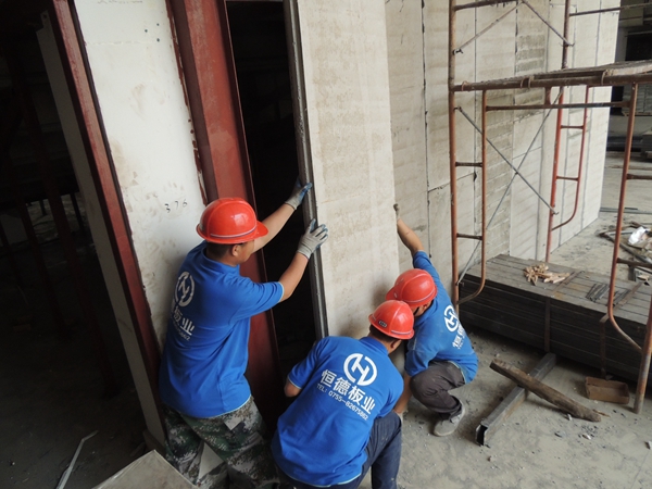 恒德板业轻质隔墙板面板是采用流浆法工艺以高温高压养护而成的中、高密度硅酸钙板。具有良好的防水性、导热系数、优异的抗折强度和湿胀率,以及良好的隔声性能等特性。芯体混凝土采用低碱水泥并经发泡,既作为胶凝材料同时又满足芯体强度和与面板的复合粘接要求,也减轻产品容重。 利用粉煤灰、电石泥等活性掺料补偿了混凝土收缩原理,一方面具有一定的胶凝作用,另一方面,又实现了工业废料的再生利用,作为生产填充料,减轻产品容重,降低了成本。同时掺加的膨胀珍珠岩粉、聚苯乙烯颗粒既可降低容重达到轻质效果,又可增加隔热保温效果。掺以破碎边角料既可实现再生利用,又可达到降低成本的目的。 为有效防止板间的裂缝,对墙板的侧面形式进行了改造,将其分别设计具有阴、阳槽,使复合墙板在拼装上墙后,利用与面板相同的材料后贴施工,贴覆墙板之间阴、阳槽的结合部位,使墙体面达到均匀一致,防止了板间的裂缝,提高墙体的保温隔热效果。 恒德板业轻质墙板能在无做任何防水饰面的情况下,用水泥粘结成池体装满水,轻质墙板背面能保持干燥,不留痕迹,在潮湿天气里也不会出现冷凝水珠。轻质隔墙板的面板是专业的防水板,有良好的防水,防潮性能,可适用于厨房、卫生间、地下室等潮湿区域。它的安装步骤为: